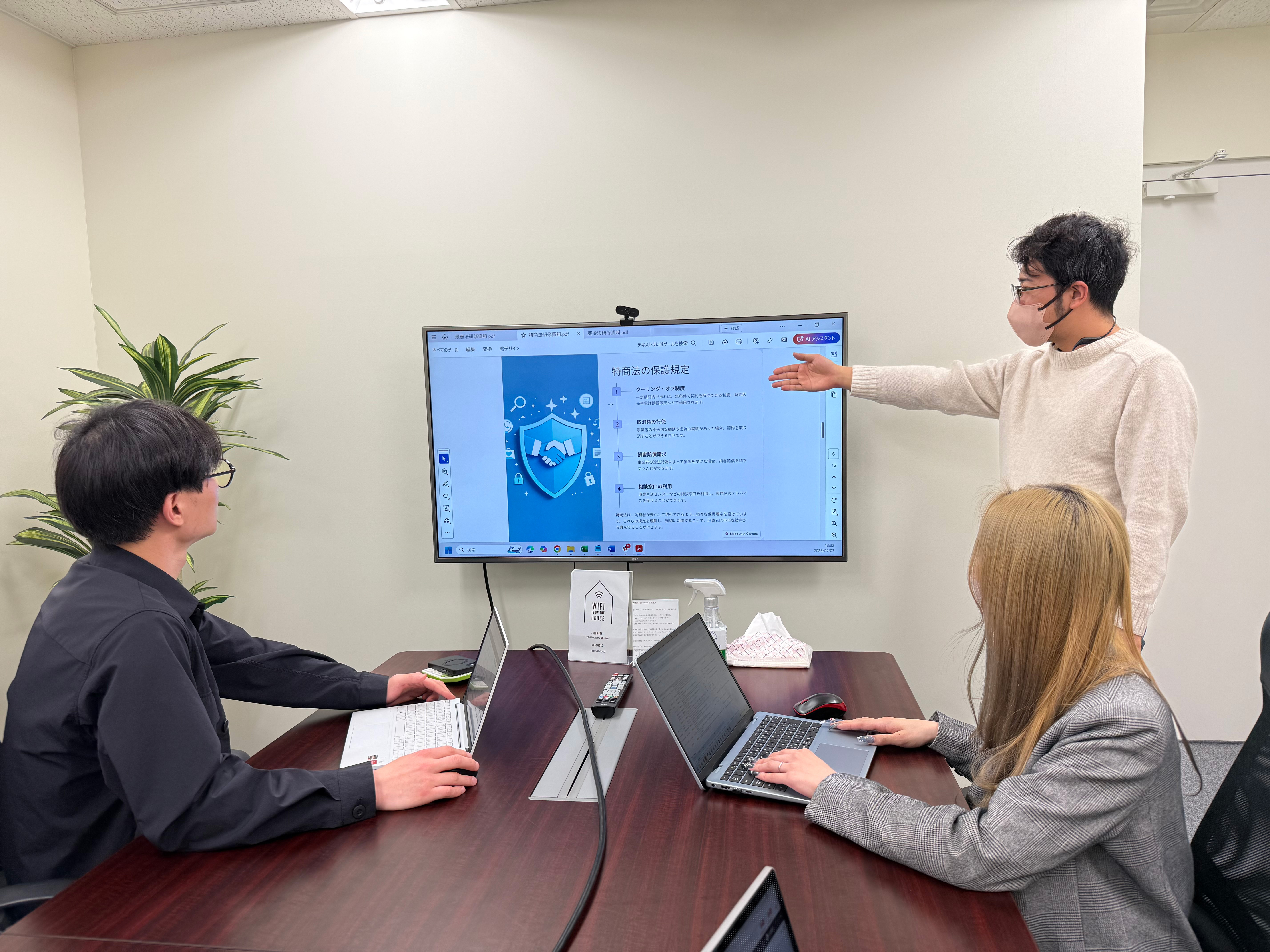 コンプライアンスとは何か、違反するとどうなるか、違反事例、違反しないためにはどうすればよいかなどを学びました。 今後も研修を行い、全社員が法令を正しく理解して対応してまいります。